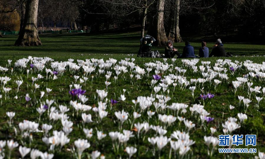 2月26日,人们在英国伦敦圣詹姆斯公园的草坪上休闲。新华社记者 韩岩 摄