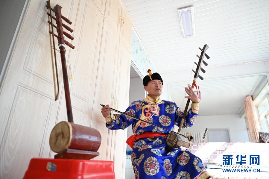 内蒙古自治区通辽市开鲁县脱贫户包莲在弹奏四弦胡琴(2月22日摄)。