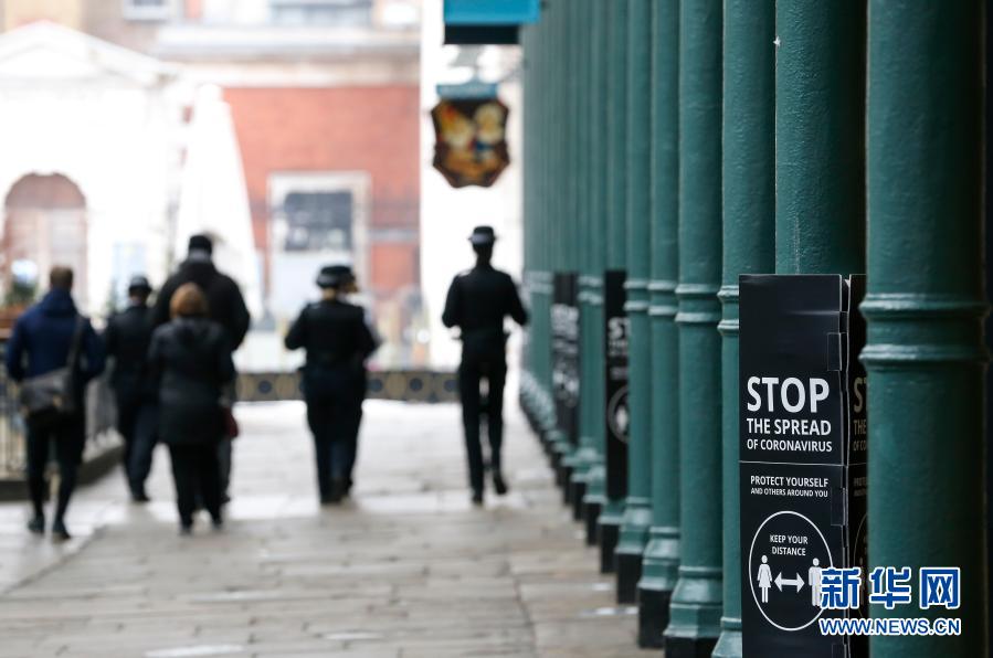 3月8日,在英国伦敦关闭的店铺旁放置着提醒人们保持社交距离的标识。