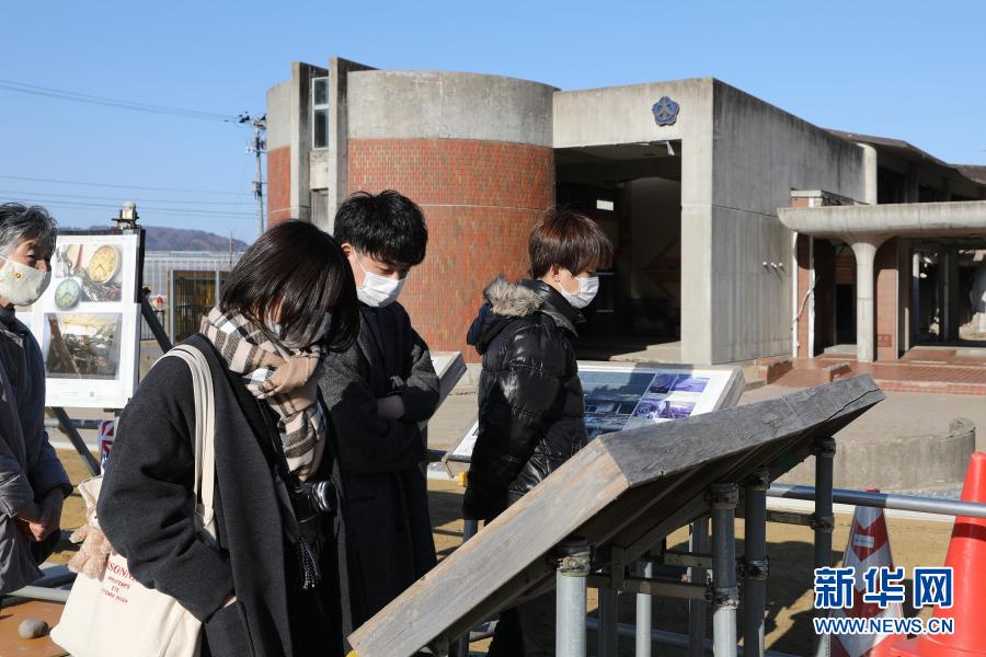 3月9日,人们阅读日本宫城县石卷市大川小学遗址前的展板了解灾情。新华社记者 杜潇逸 摄