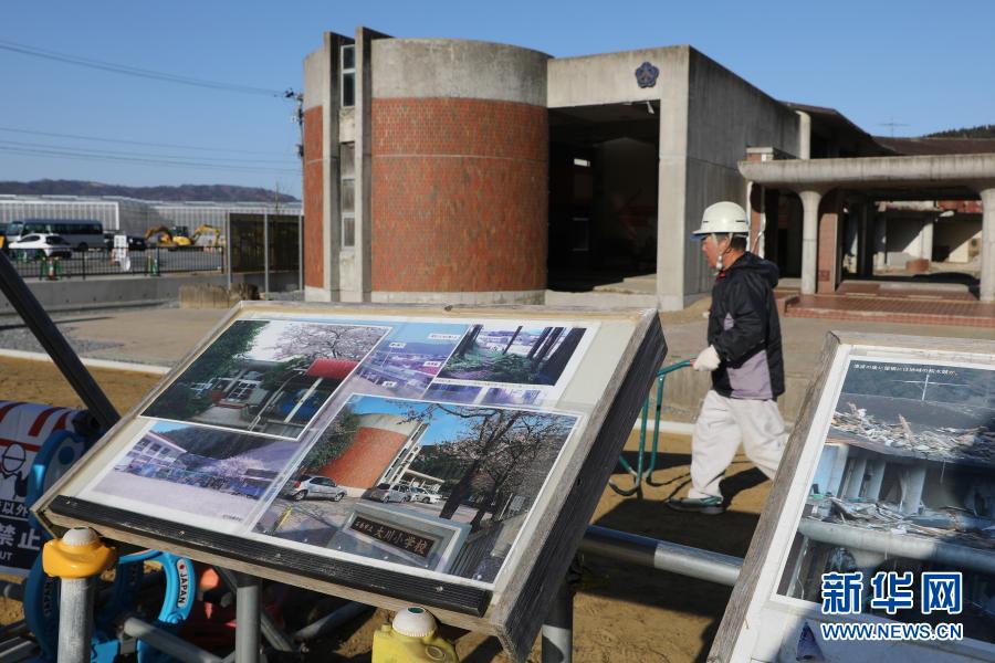 3月9日,日本宫城县石卷市大川小学遗址前的展板展示受灾前的校园景色。新华社记者 杜潇逸 摄