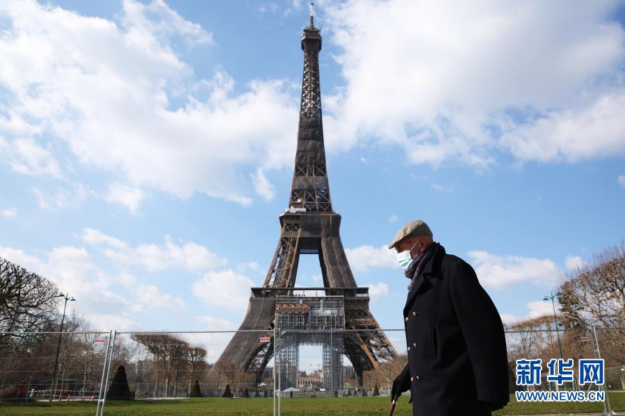 3月19日,戴口罩的行人从法国巴黎战神广场走过。法国总理卡斯泰18日宣布,“法国新冠病毒传播速度明显加快”,自19日午夜起在16个省执行至少为期4周的封闭隔离措施。新华社记者高静摄