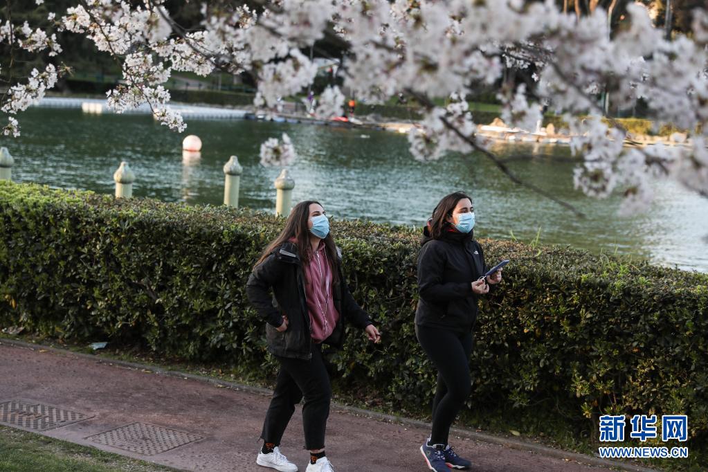 3月24日,佩戴口罩出行的市民从意大利首都罗马盛开的樱花树下走过。