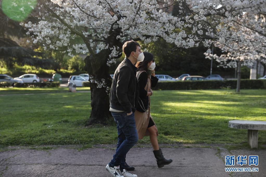 3月24日,佩戴口罩出行的市民从意大利首都罗马盛开的樱花树下走过。新华社记者 程婷婷 摄