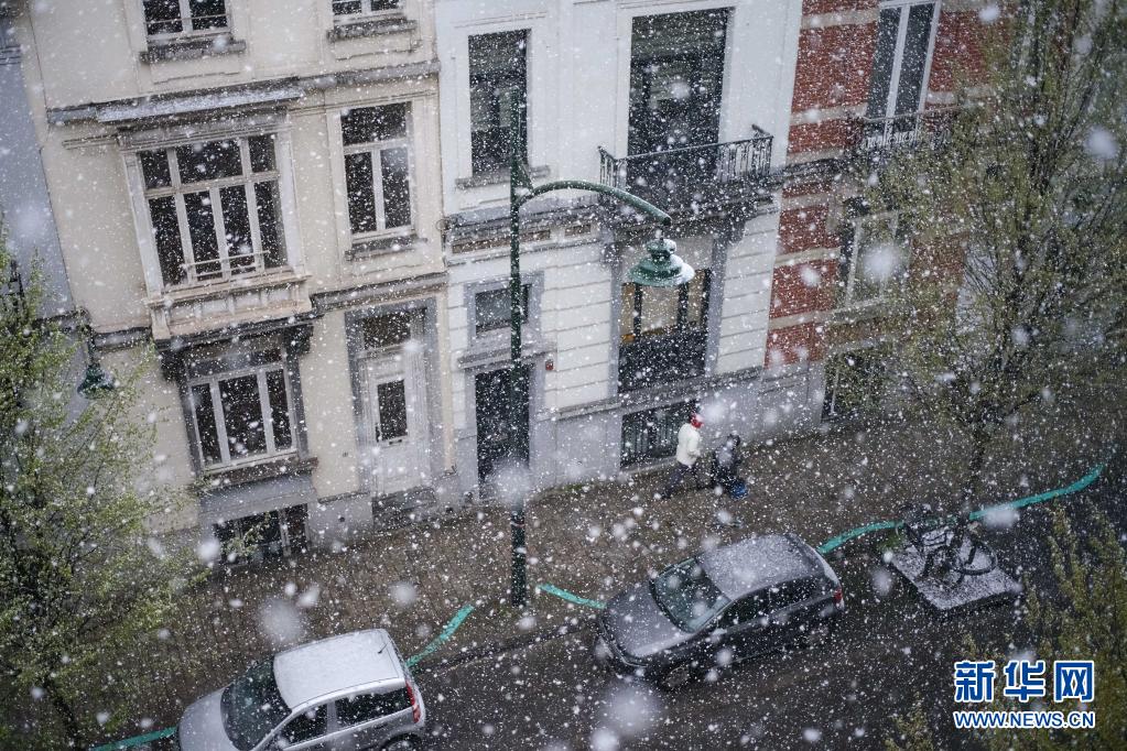 这是4月5日在比利时布鲁塞尔拍摄的雪景。