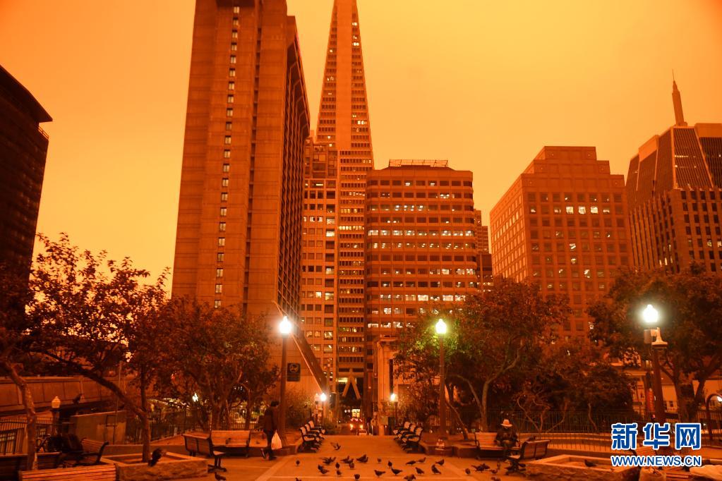 2020年9月9日,美国加州北部山火形成的烟尘遮天蔽日,旧金山中午时分如夜晚般昏暗。
