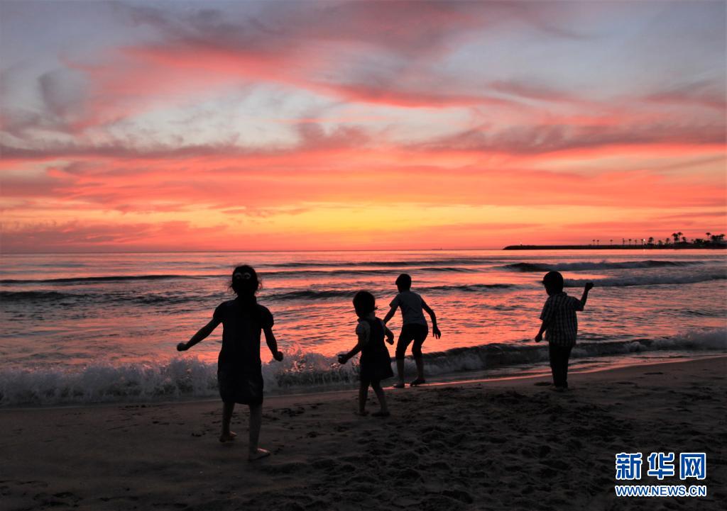 4月23日,孩子们在傍晚的黎巴嫩贝鲁特海滨玩耍。