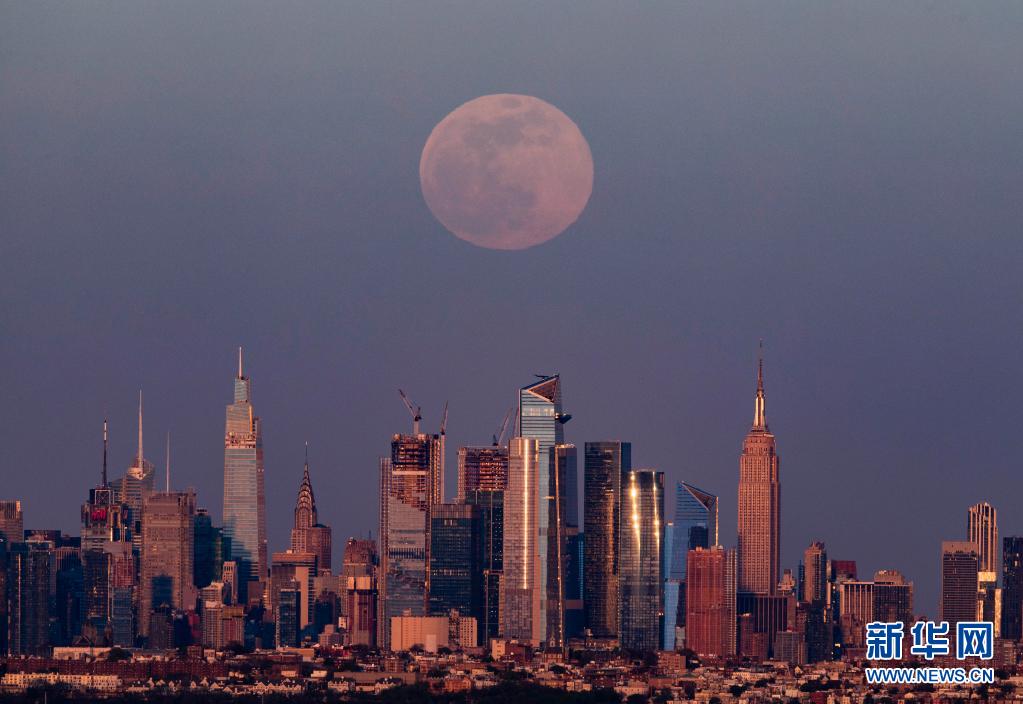4月26日,“超级月亮”从美国纽约曼哈顿的天际线上升起。