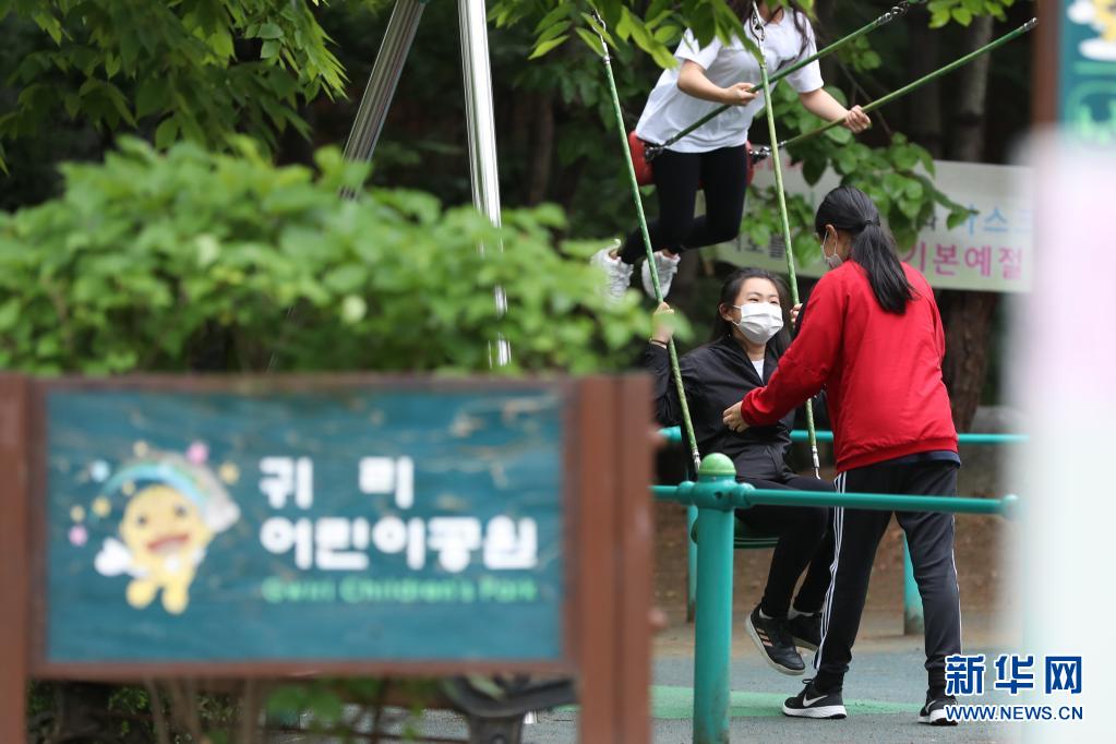 5月21日,戴口罩的青少年在韩国首尔的一个公园荡秋千。