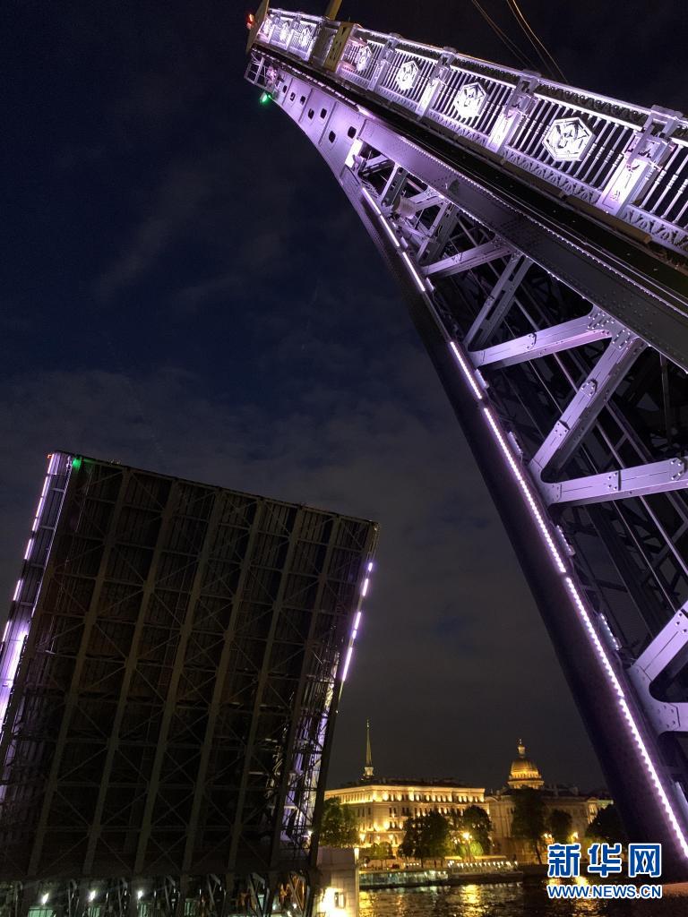 这是6月1日凌晨在俄罗斯圣彼得堡拍摄的开桥时的冬宫桥。