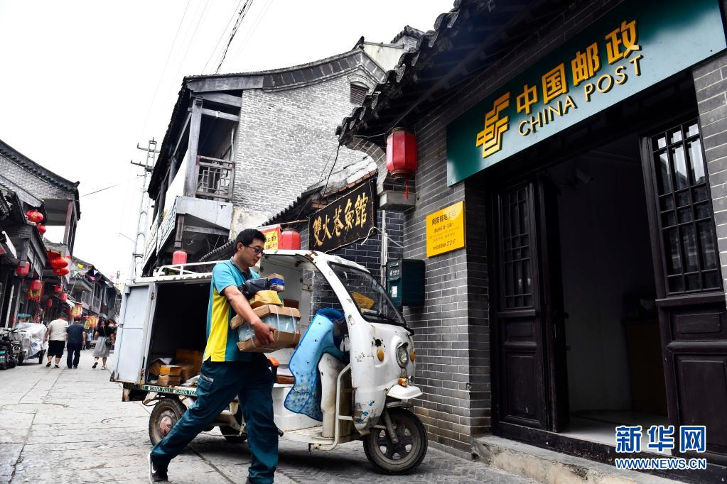 6月20日,在微山县南阳镇,邮递员王少朋在搬卸邮件。
