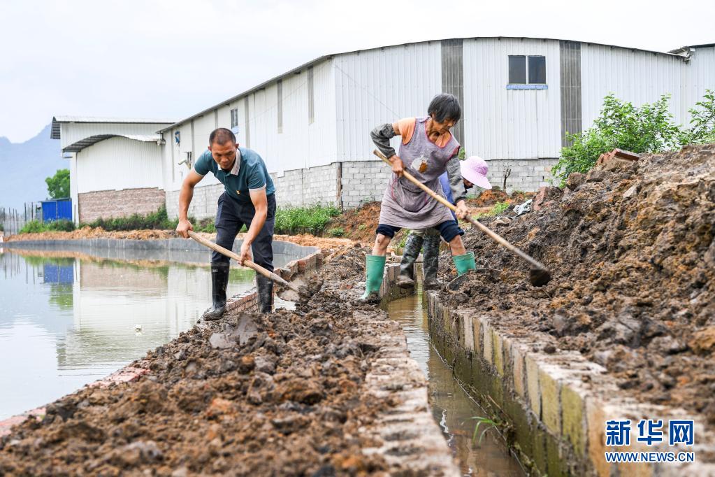5月15日,广西贺州市钟山县公安镇廖屋村党总支书记、村委会主任廖其智(左一)与村民一起修理鱼塘。