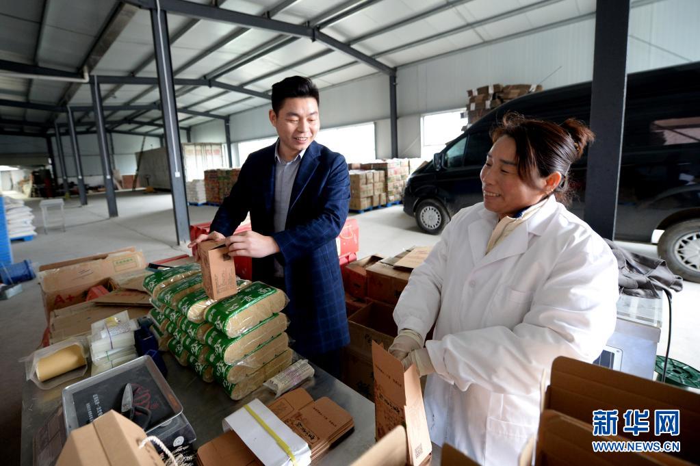 在河南省信阳市潢川县付店镇刘楼村,村党支部书记胡晓柱(左)与一位空心贡面生产工人交流(3月18日摄)。