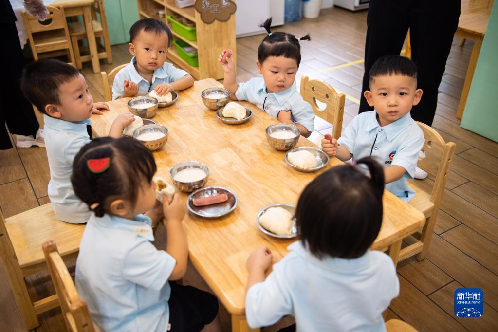 9月6日,在湖南省长沙市长沙县一家幼儿园,学生们吃早餐。