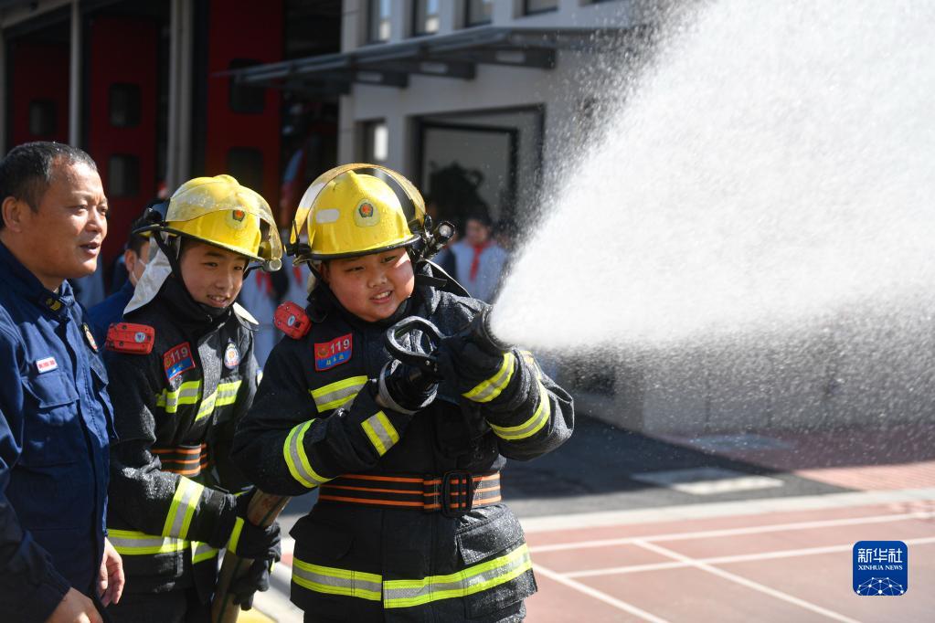 11月9日,吴兴区埭溪镇上强中学的学生在消防救援站体验喷水灭火实际操作。