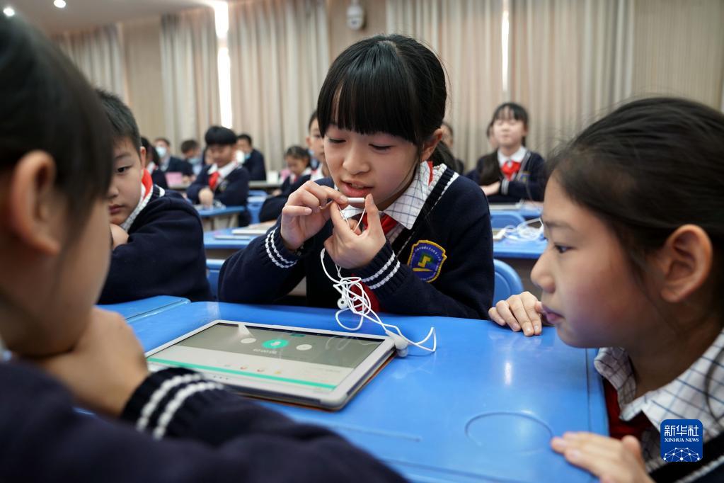 11月18日,在上海市杨浦区平凉路第三小学的“教学助手”展示课上,四年级的学生将小组研讨结果录音并上传。