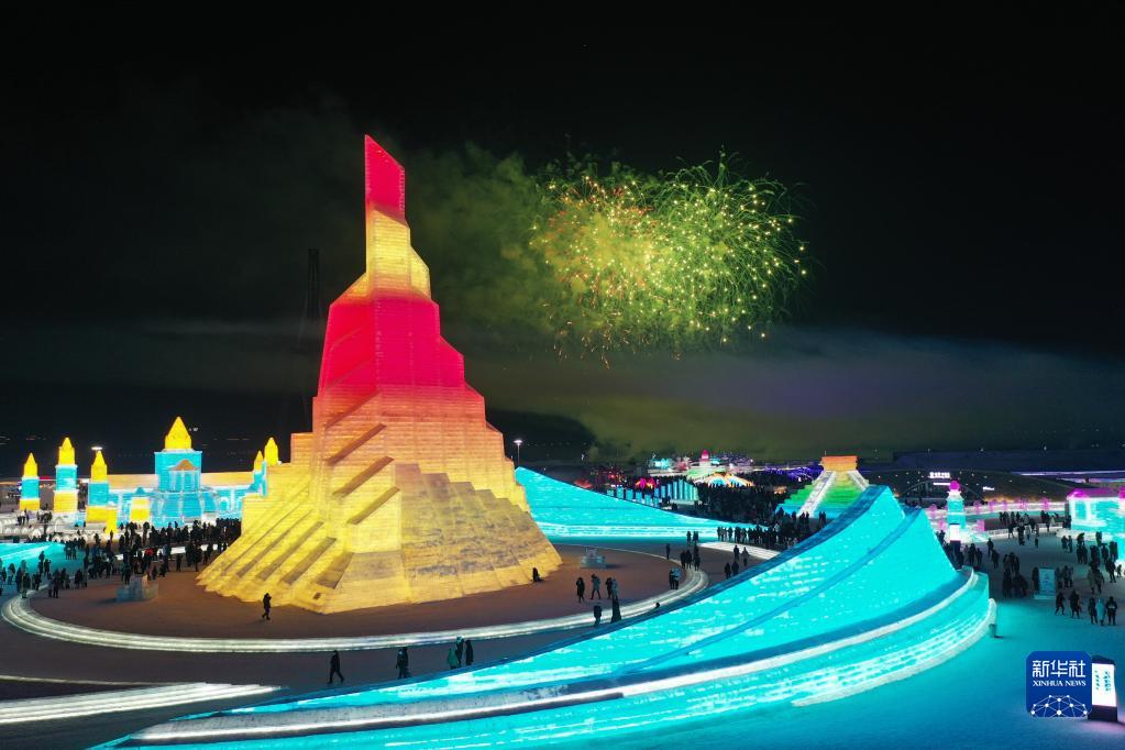 当晚,为迎接新年的到来,在第二十三届哈尔滨冰雪大世界的夜空中,上演了一场璀璨的“烟花秀”。新华社记者 谢剑飞 摄