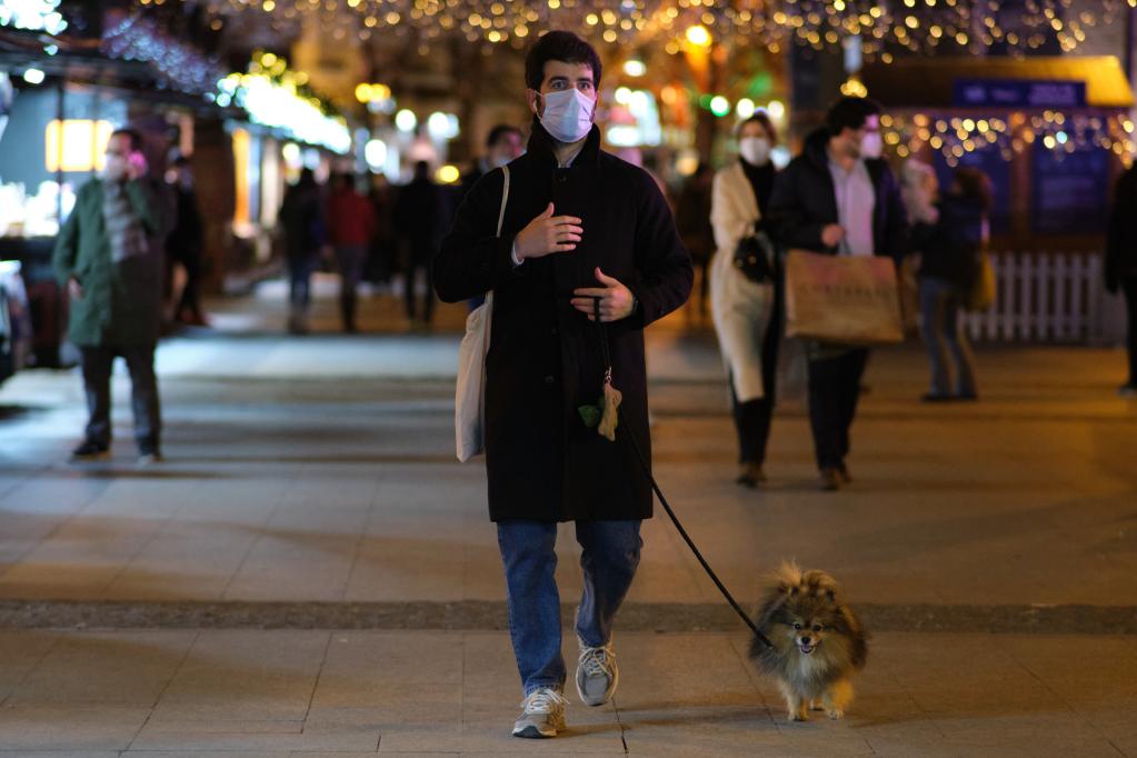 1月14日,一名戴口罩的男子在西班牙马德里街头遛狗。