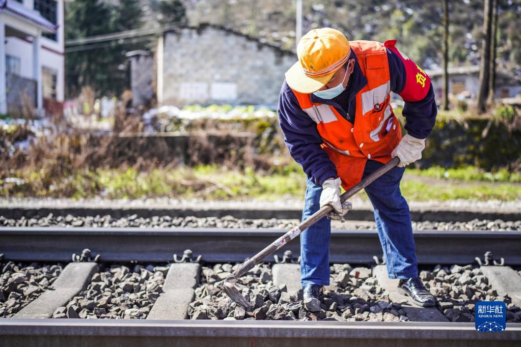春运期间,中国铁路成都局集团有限公司六盘水工电段综合维修车间职工坚守在沪昆铁路梅花山一线。梅花山平均海拔2300多米,常伴雨雾凝冻天气,日常线路养护维修难度大。六盘水工电段职工每天步行十余公里,排查铁路线路安全隐患,保障来往列车运行安全。