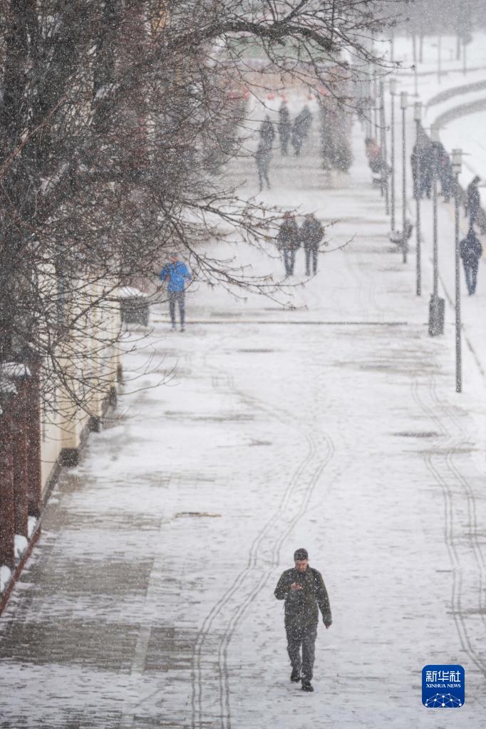 2月10日,人们走在俄罗斯首都莫斯科积雪的道路上。