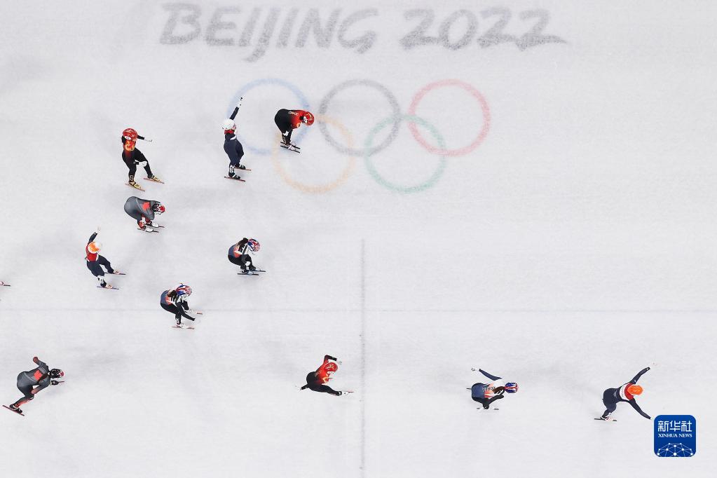2月13日,中国队选手范可新(下右三)在比赛中冲线。