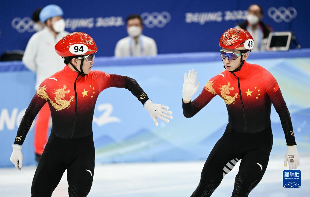 2月16日,中国队选手武大靖(右)和李文龙在比赛中。