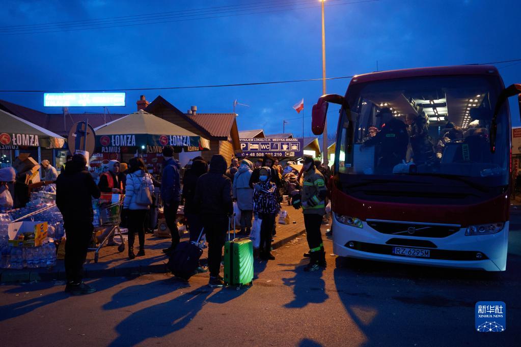 2月26日,在波兰边境关口梅迪卡,乌克兰人登上大巴车。