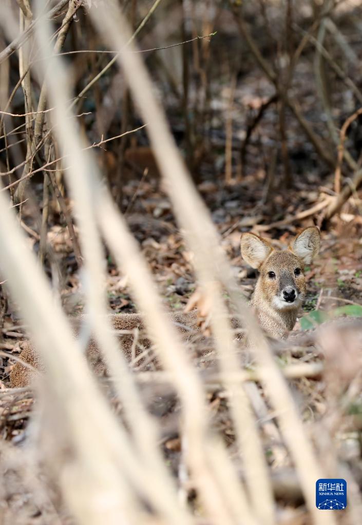 3月3日,一头獐在松江叶榭獐极小种群恢复与野放基地树林中休憩。