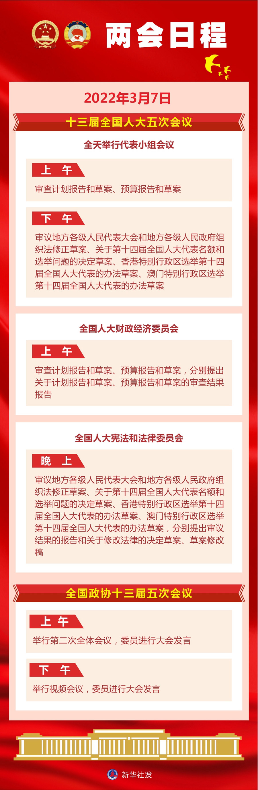 上午,全国人大财政经济委员会审查计划报告和草案、预算报告和草案,分别提出关于计划报告和草案、预算报告和草案的审查结果报告。晚上,全国人大宪法和法律委员会审议地方各级人民代表大会和地方各级人民政府组织法修正草案、关于第十四届全国人大代表名额和选举问题的决定草案、香港特别行政区选举第十四届全国人大代表的办法草案、澳门特别行政区选举第十四届全国人大代表的办法草案,分别提出审议结果的报告和关于修改法律的决定草案、草案修改稿。