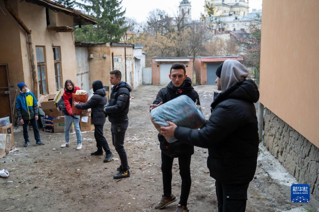 3月5日,人们在乌克兰利沃夫一个物资收发站传递物资。