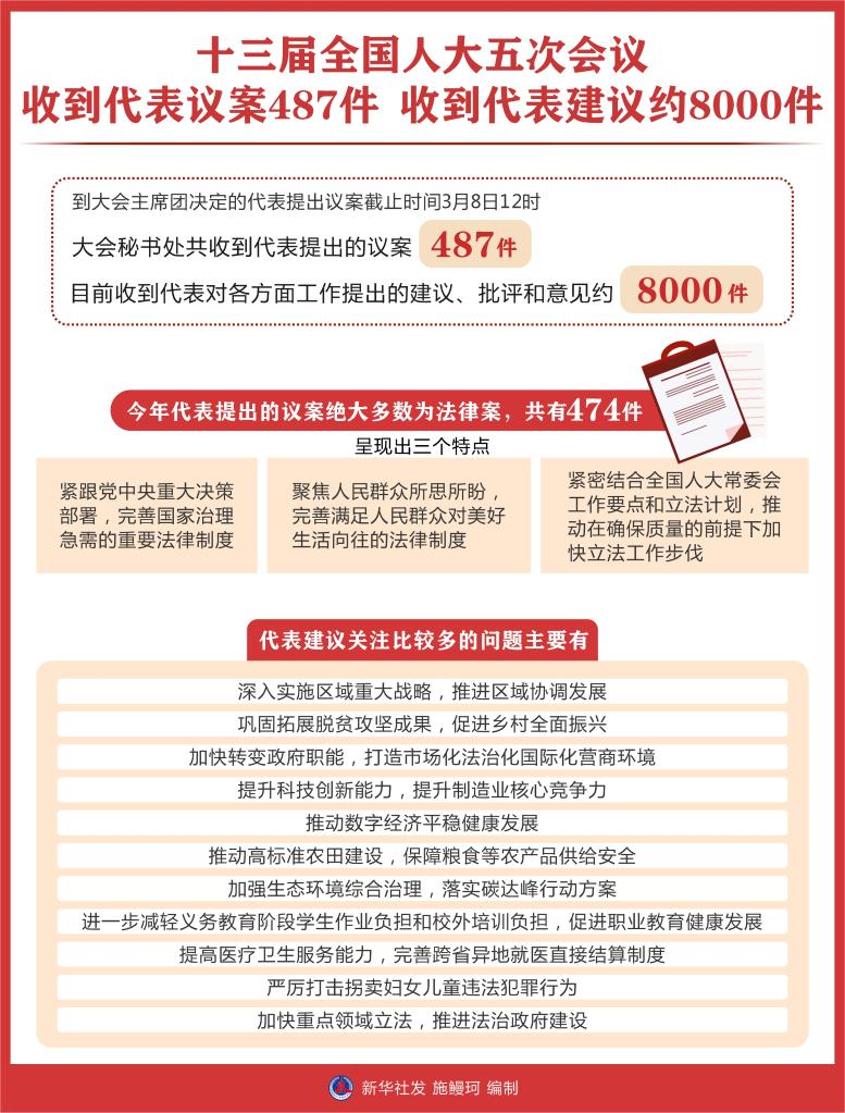 十三届全国人大五次会议收到代表议案487件 收到代表建议约8000件