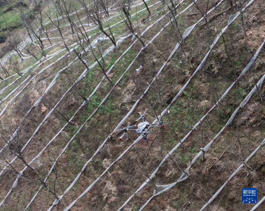 3月16日,无人机在杭州市临安区清凉峰镇九都村的生态治理试点林地给套种植物施肥(无人机照片)。