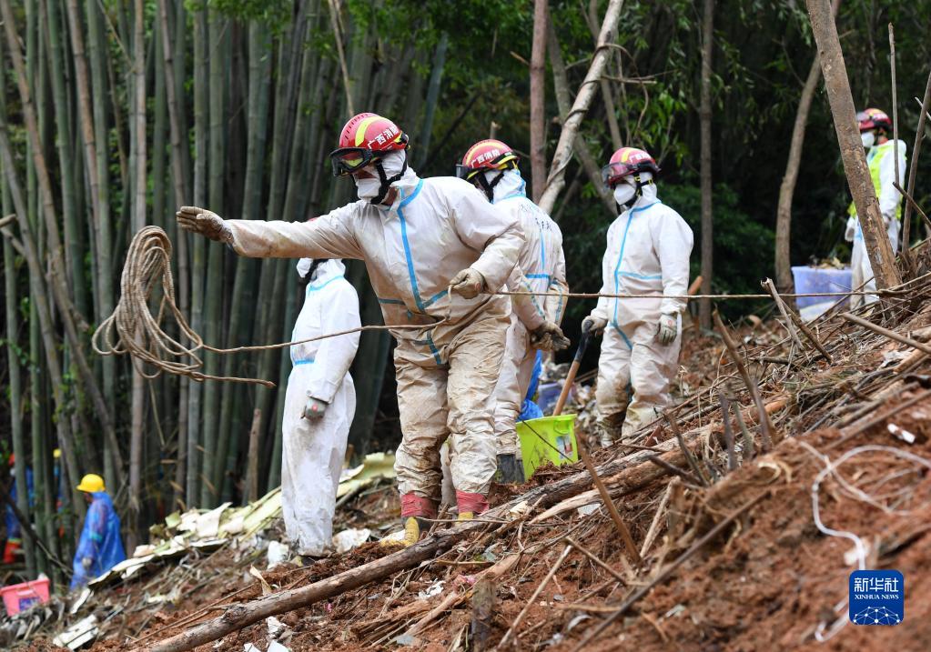 在东航MU5735客机坠毁事故核心现场,两边山势陡,搜救人员为了安全起见,将安全绳一头挂在山上的树木上,一头系在自己腰间进行搜救。