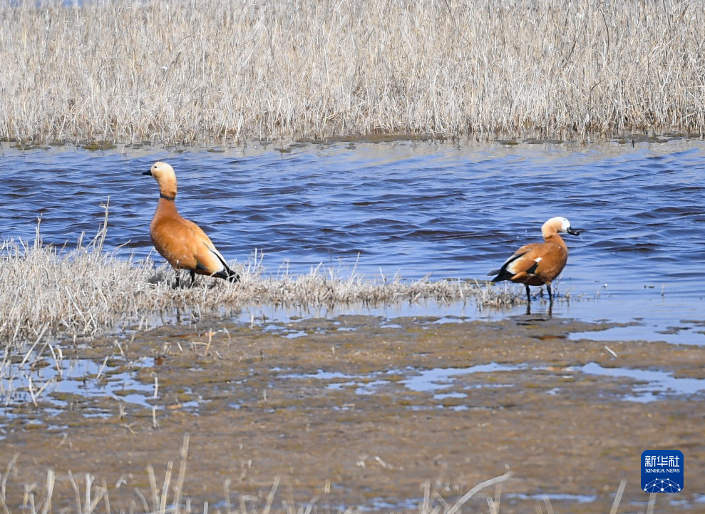 3月30日,两只赤麻鸭在土默川平原上嬉戏觅食。