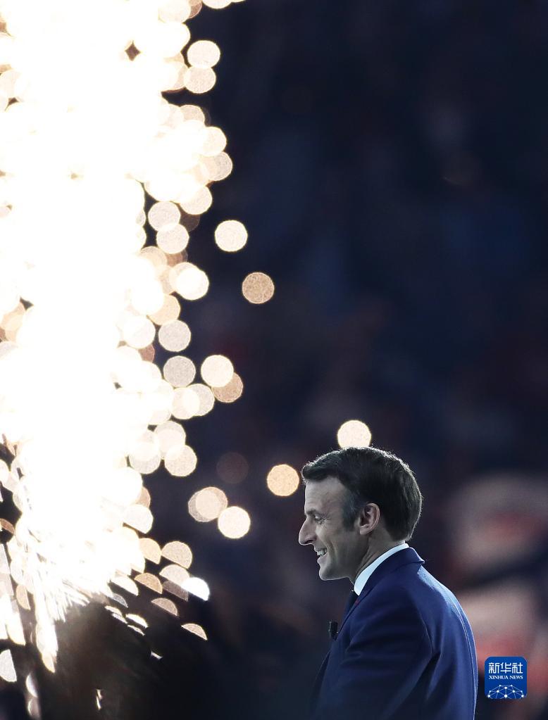 4月2日,法国总统马克龙在巴黎附近的拉德芳斯体育馆出席竞选集会。