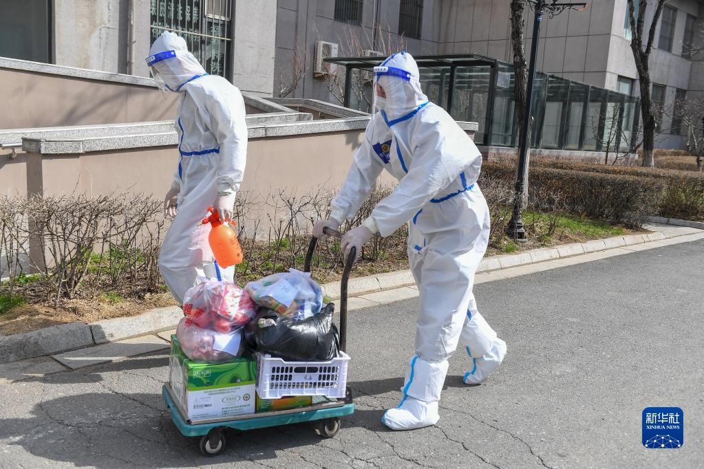 4月8日,在吉林市丰满区中环滨江花园小区,刘星硕(右)和队友曹思达为居民送生活物资。新华社记者 张楠 摄