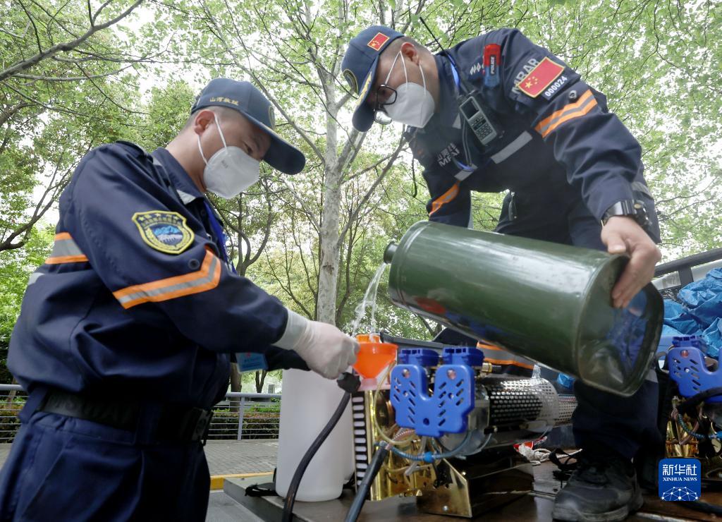 4月13日,兰州山河救援志愿服务队队员在上海市黄浦区消杀前为消杀设备加油。