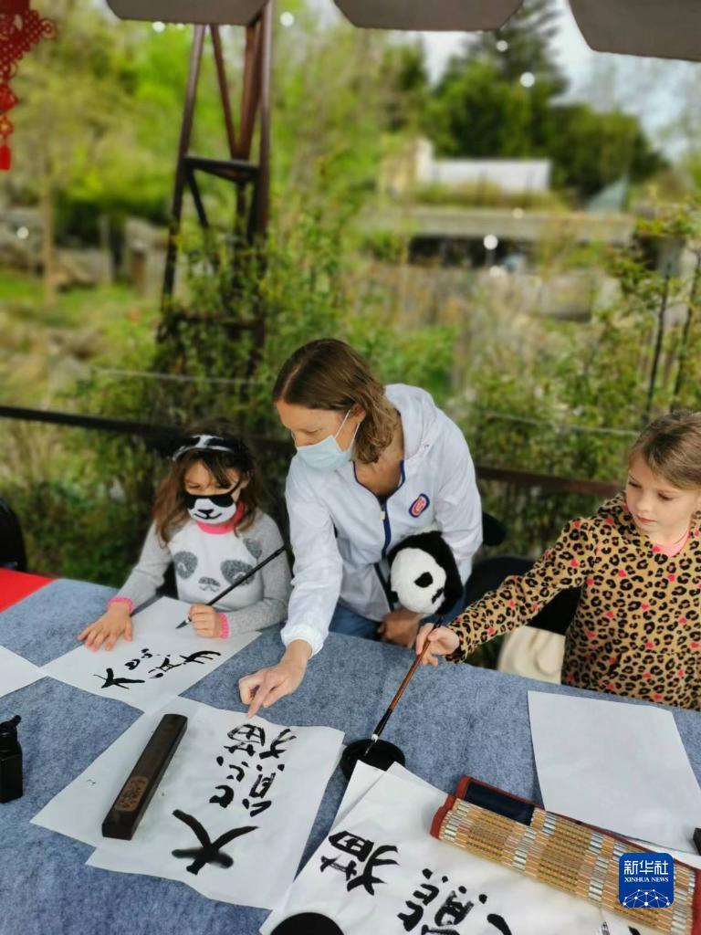 4月16日,在美国华盛顿史密森学会国家动物园,游客体验用毛笔书写汉字“大熊猫”。