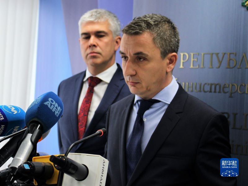 4月27日,保加利亚能源部长亚历山大·尼科洛夫(右)在新闻发布会上向记者介绍相关情况。新华社记者 林浩 摄