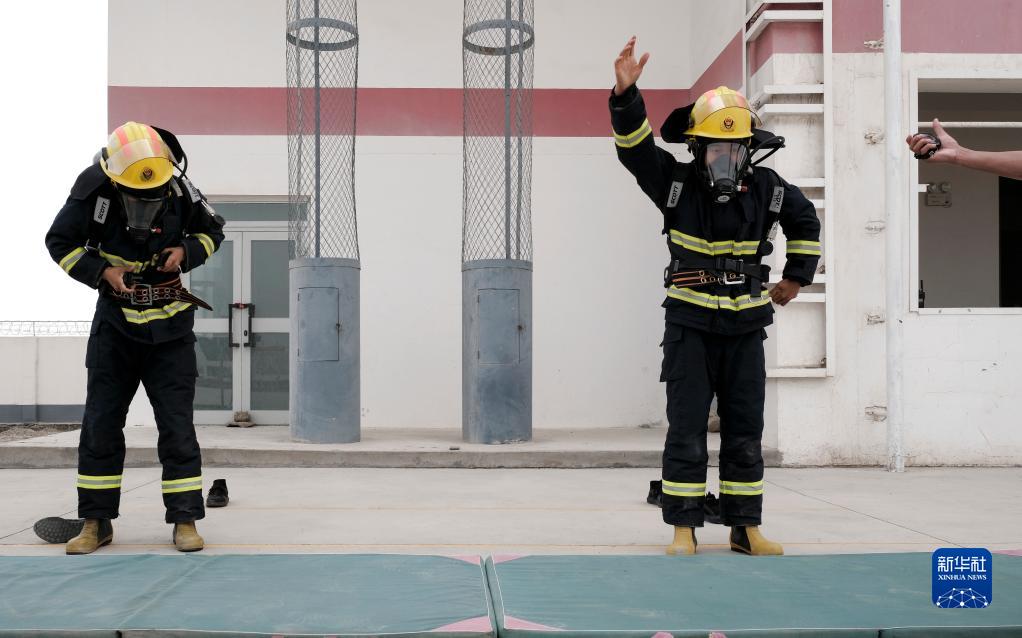 5月18日,在新疆巴音郭楞蒙古自治州库尔勒市上库工业园区特勤站,比赛选手参加原地着装佩戴空气呼吸器科目。