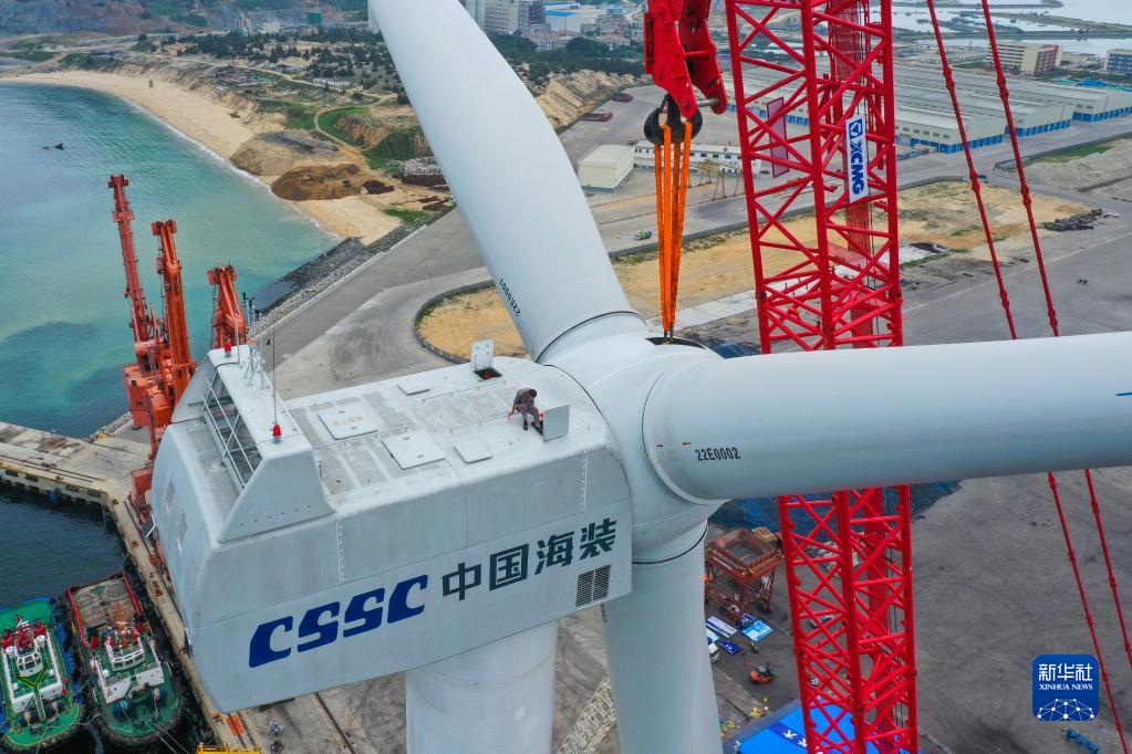 工程人员登上完成总装的国内首台深远海浮式风电装备“扶摇号”发电机组顶部,准备进行解除吊缆作业(5月27日摄,无人机照片)。