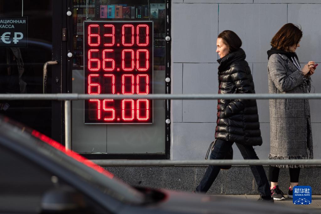 5月24日,在俄罗斯首都莫斯科,行人经过一家外汇兑换点。