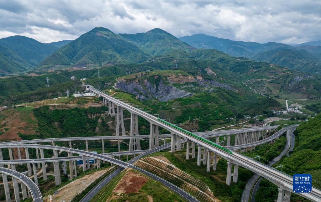复兴号列车通过中老铁路南溪河特大桥(无人机照片,6月2日摄)。