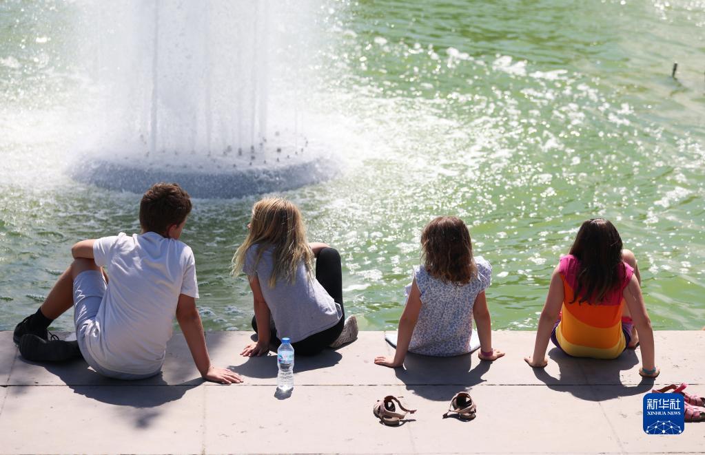 6月16日,在法国巴黎埃菲尔铁塔附近,人们在特罗卡德罗广场的喷泉旁避暑纳凉。