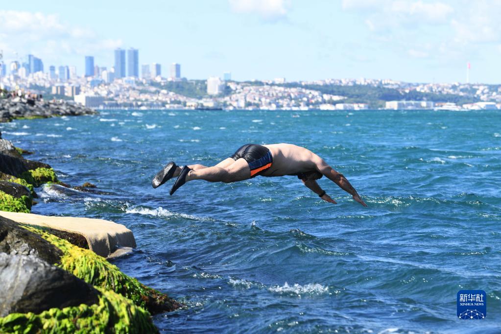 6月18日,一名男子跳入土耳其伊斯坦布尔的博斯普鲁斯海峡游泳消暑。