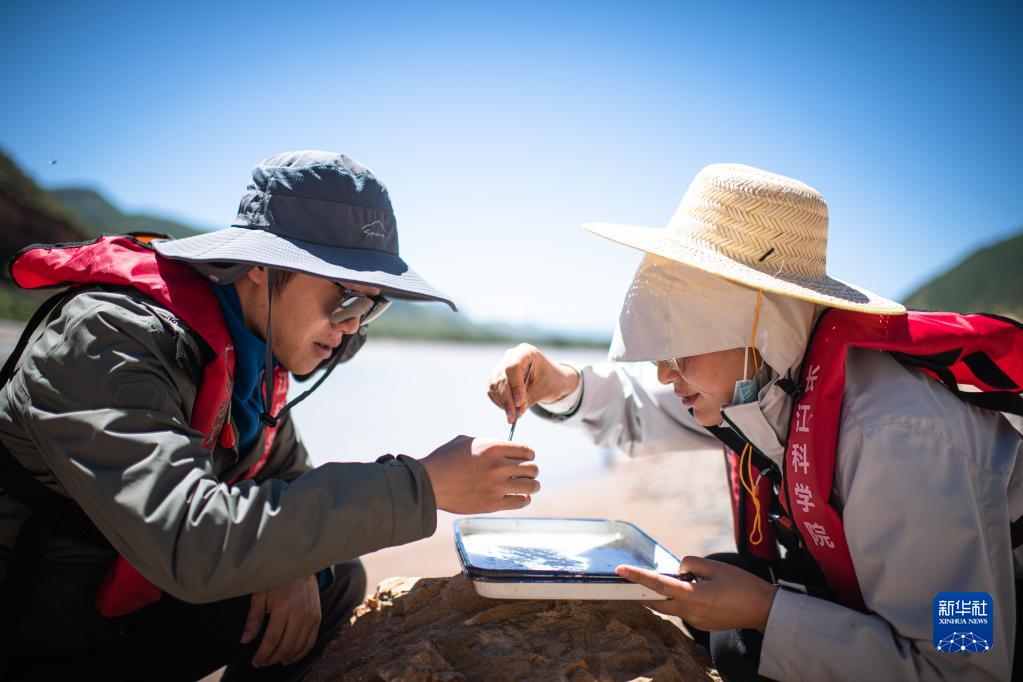 7月24日,长江科学院科考队员李鲁丹(右)与刘晗在澜沧江源区的扎曲采集底栖动物样本。