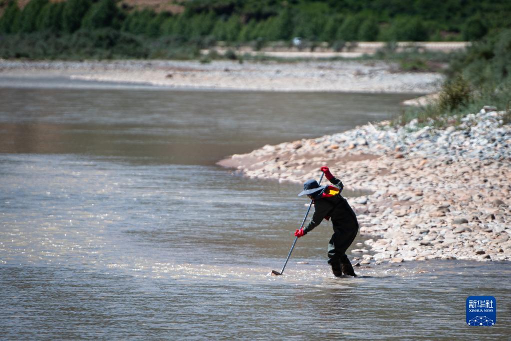 7月24日,长江科学院科考队员刘晗在澜沧江源区的扎曲采集鱼类样本。