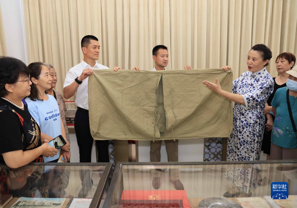 7月29日,展品提供者杨殿军(左四)和工作人员一起展示上世纪70年代部队使用的马褡子。 在北京市通州区举办的一场“老物件”展览上,展示了包括人民军队各时期的奖章、衣物、照片等在内的600余件收藏品,收藏者希望通过这些承载记忆的“老物件”讲述背后的故事,弘扬先辈的革命精神。新华社记者 殷刚 摄 |