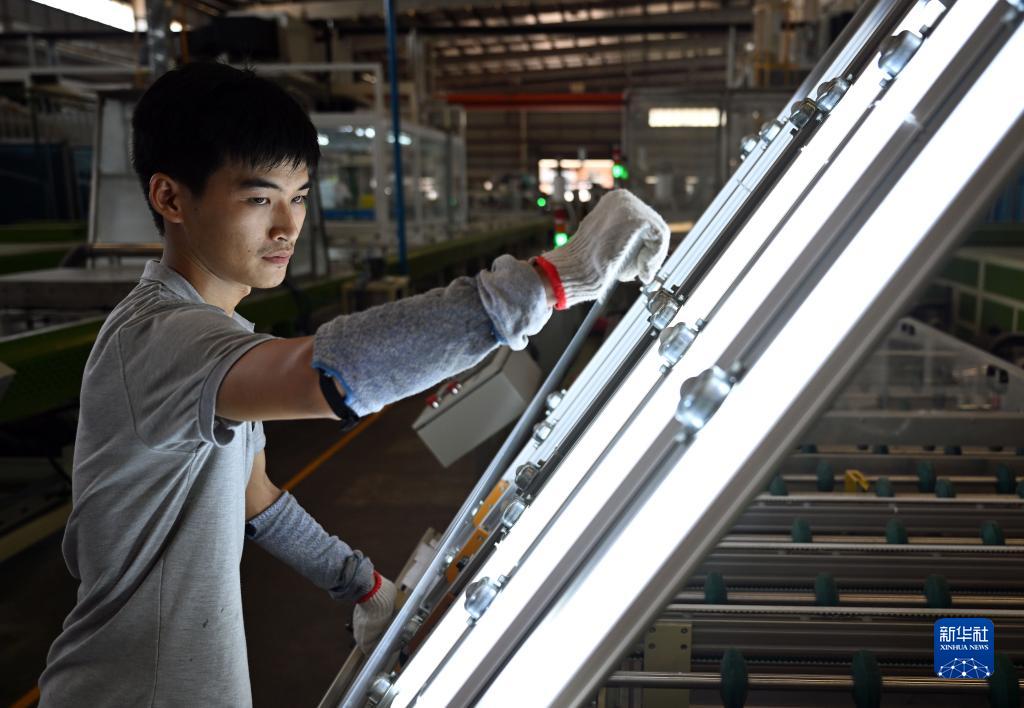 位于海南澄迈的信义玻璃(海南)有限公司工人在车间检查玻璃制品(7月19日摄)。