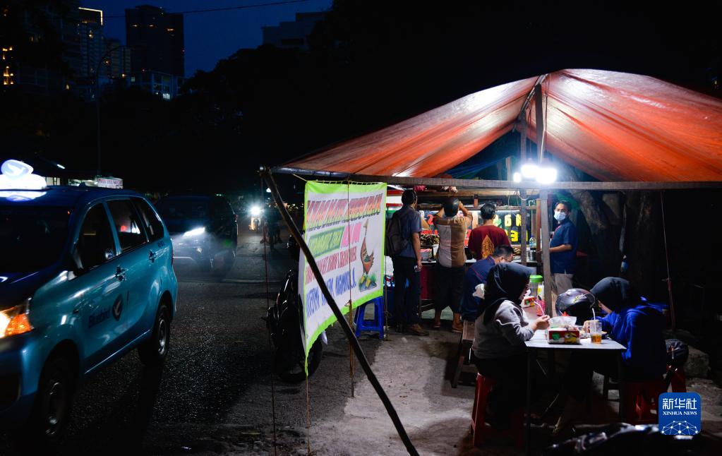 这是8月1日晚拍摄的印度尼西亚首都雅加达街头的小吃摊。